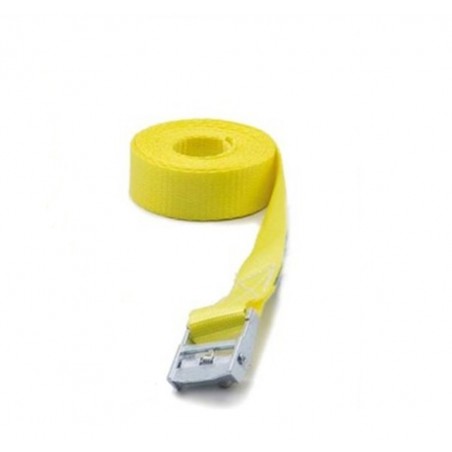 Correa extrafuerte de poliéster amarillo intenso, diseñada para asegurar cargas de forma rápida y fiable. Equipada con una hebilla metálica galvanizada con protección azul, ofrece una sujeción firme sin dañar la mercancía.